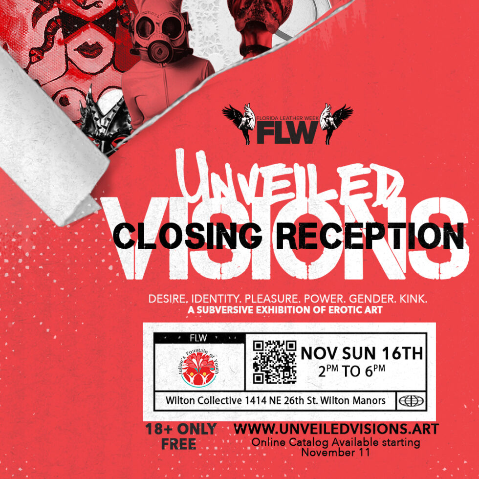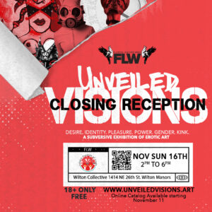 SUNDAY UNVEILED VISIONS CLOSING RECEPTION Wilton Collective | 5 PM – 8 PM Over 60 Artists from Across the Country More than 200 Works of Erotic Art GAY.STRAIGHT.TRANS.BI.QUEER.POLY.FETISH.KINK.HUMAN Unveiled Visions